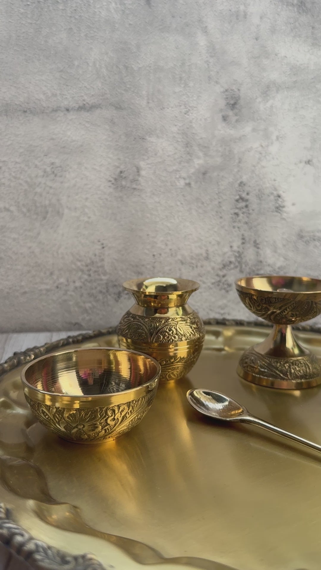 Adorned with decorative engravings or traditional motifs, the brass Pooja thali set serves not only a functional purpose but also enhances the aesthetic appeal of your prayer space. This set is perfect for special occasions, festivals, or daily rituals, making it a meaningful addition to any home.