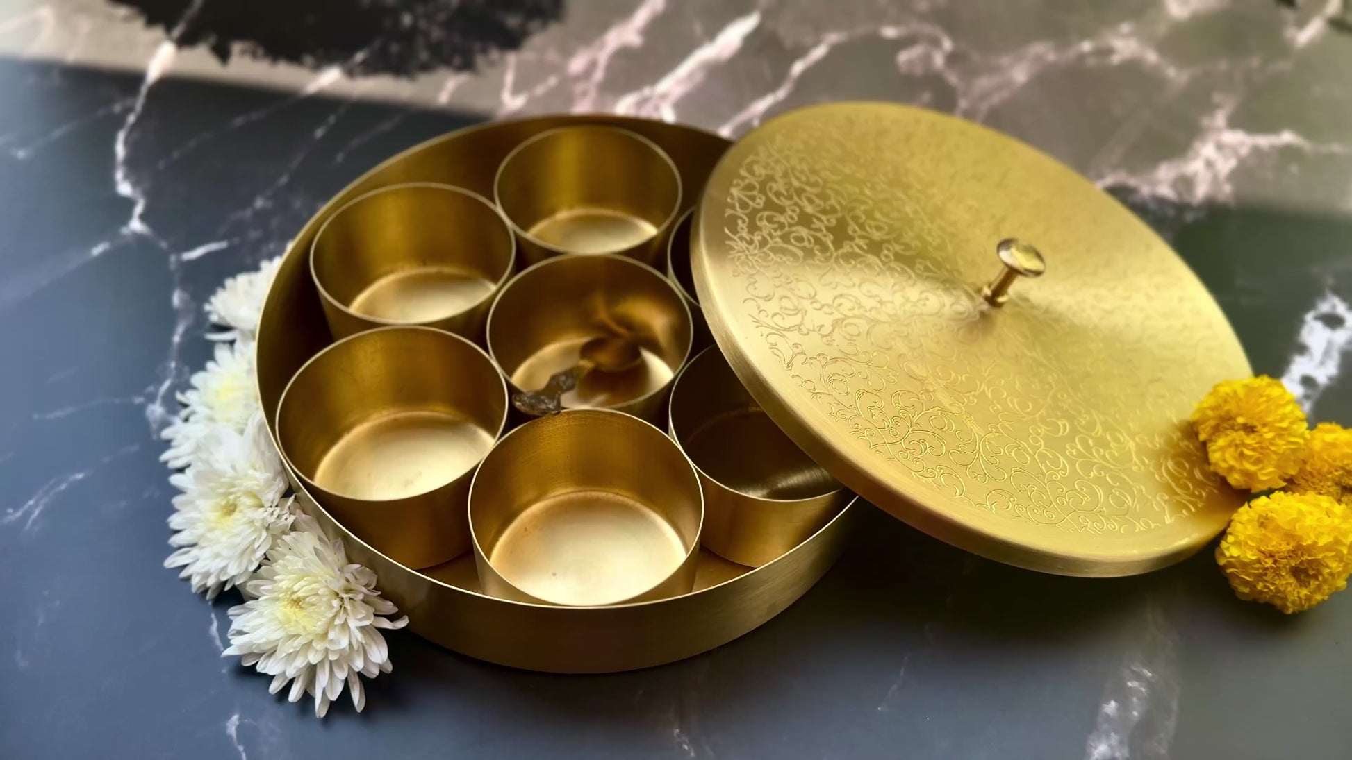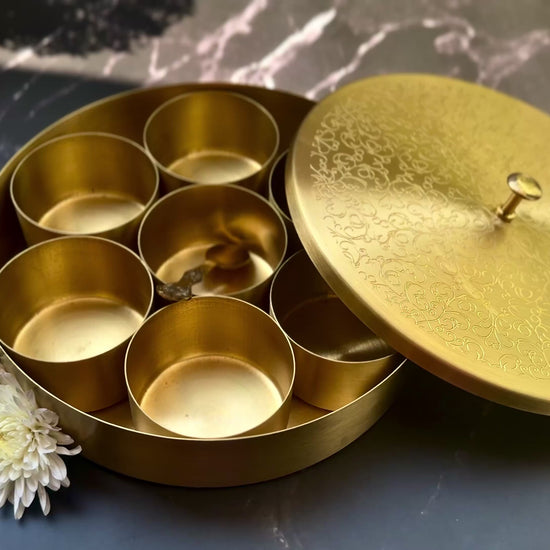 Discover the charm of our elegant brass spice box, designed to bring both functionality and beauty to your kitchen. This traditional Indian accessory features multiple compartments, perfect for storing your favorite spices, herbs, and seasonings. Crafted from durable brass, it not only preserves the freshness of your spices but also adds a touch of vintage elegance to your culinary space. Ideal for everyday cooking or as a decorative piece, this spice box is a must-have for any cooking enthusiast. Enhance your culinary journey with this timeless piece!